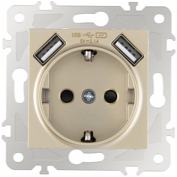 Розетка встраиваемая с заземлением, шторками и USBх2 DC 5V 2.1A Arte Milano am-203 203.47-1.shampan, Шампань, am-203 203.47-1.shampan