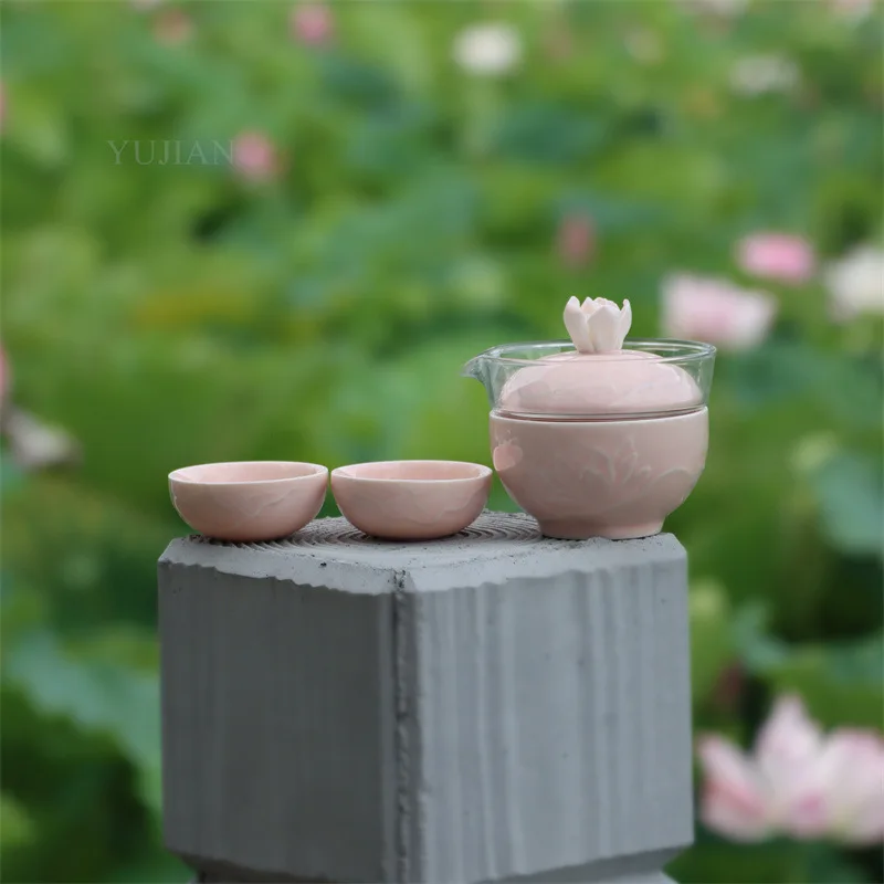 Розовая керамическая быстрая чайная чашка, один горшок, три чашки, портативный дорожный чайный сервиз для кемпинга, стеклянная чаша для чая в японском стиле