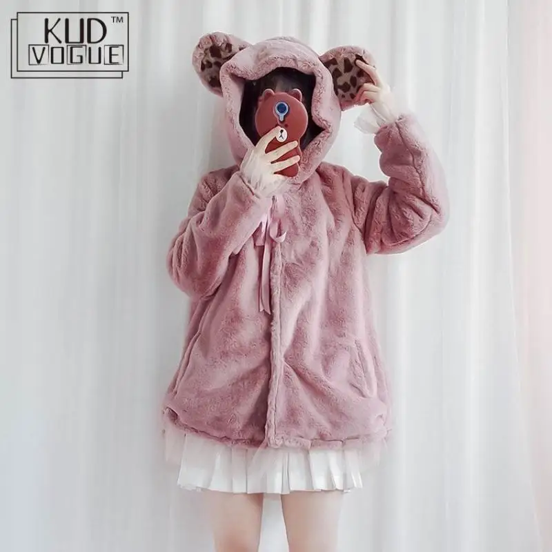 Розовое пальто в стиле Харадзюку, зимнее мягкое теплое японское пальто для девочек, милая плюшевая Меховая куртка в стиле каваи с ушками мед...