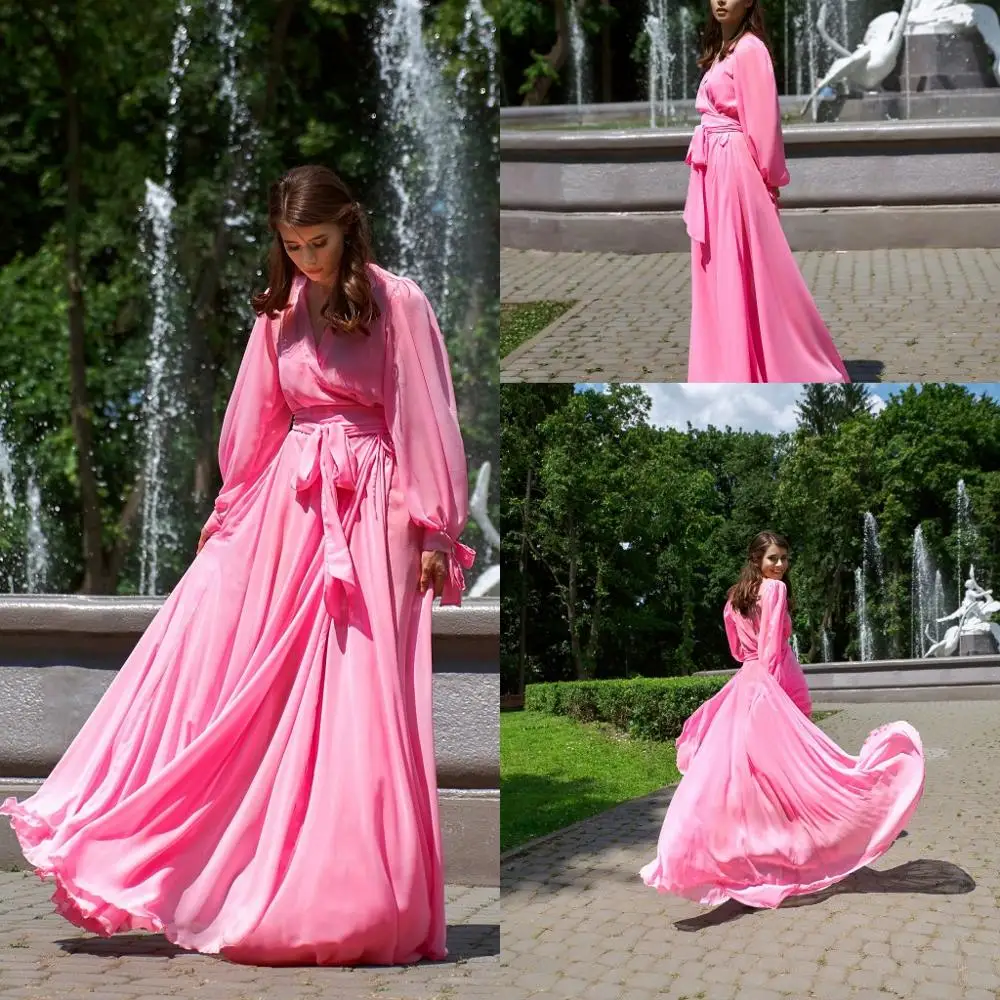 Розовые Свадебные платья Длина пола платье для выпусквечерние вечера женский халат Свадебные платья шелковая ночная рубашка с поясом одежда для сна