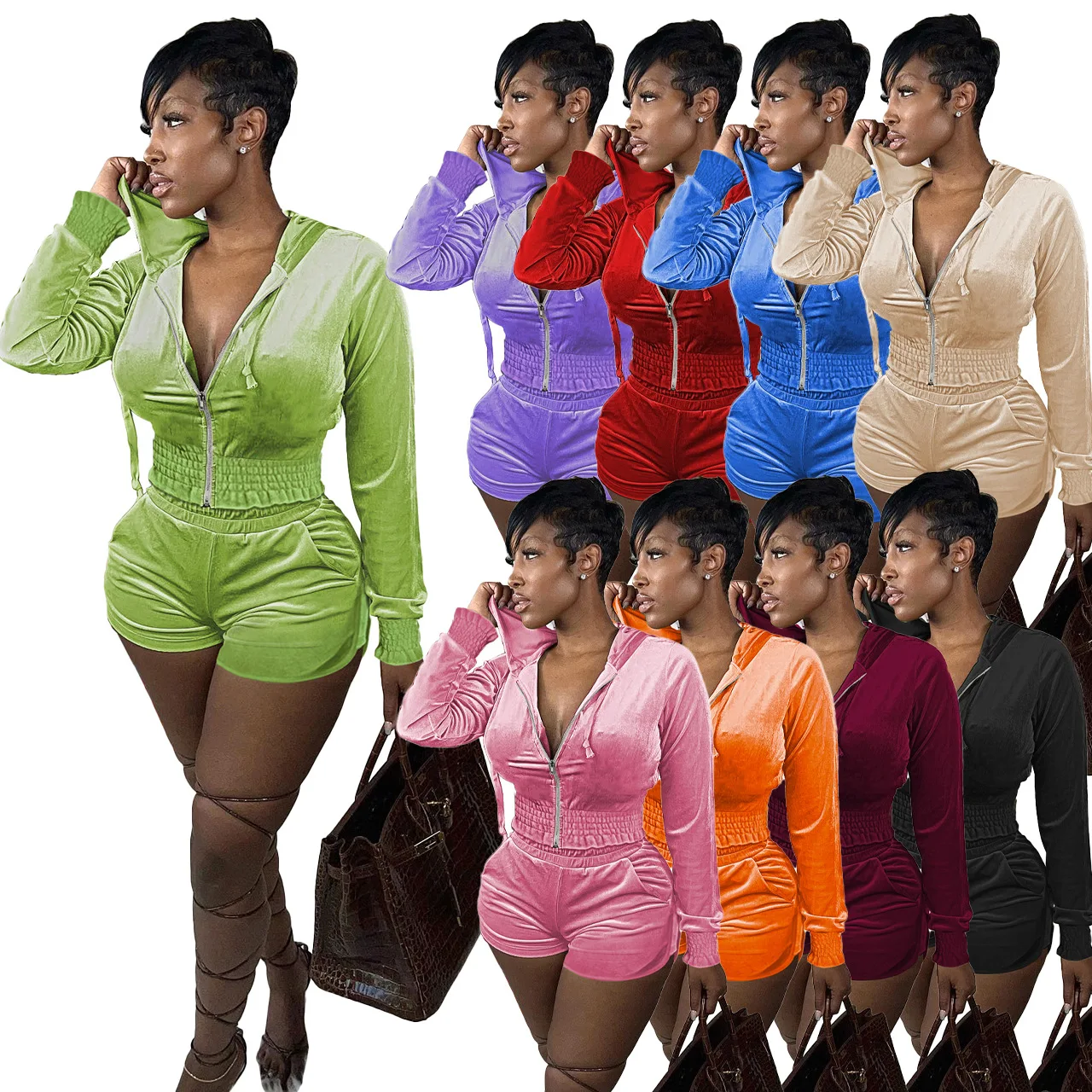 Розовый бархатный сексуальный спортивный костюм APIPEE из 2 предметов, Женский Повседневный Спортивный костюм, худи с длинным рукавом, короткие топы и шорты