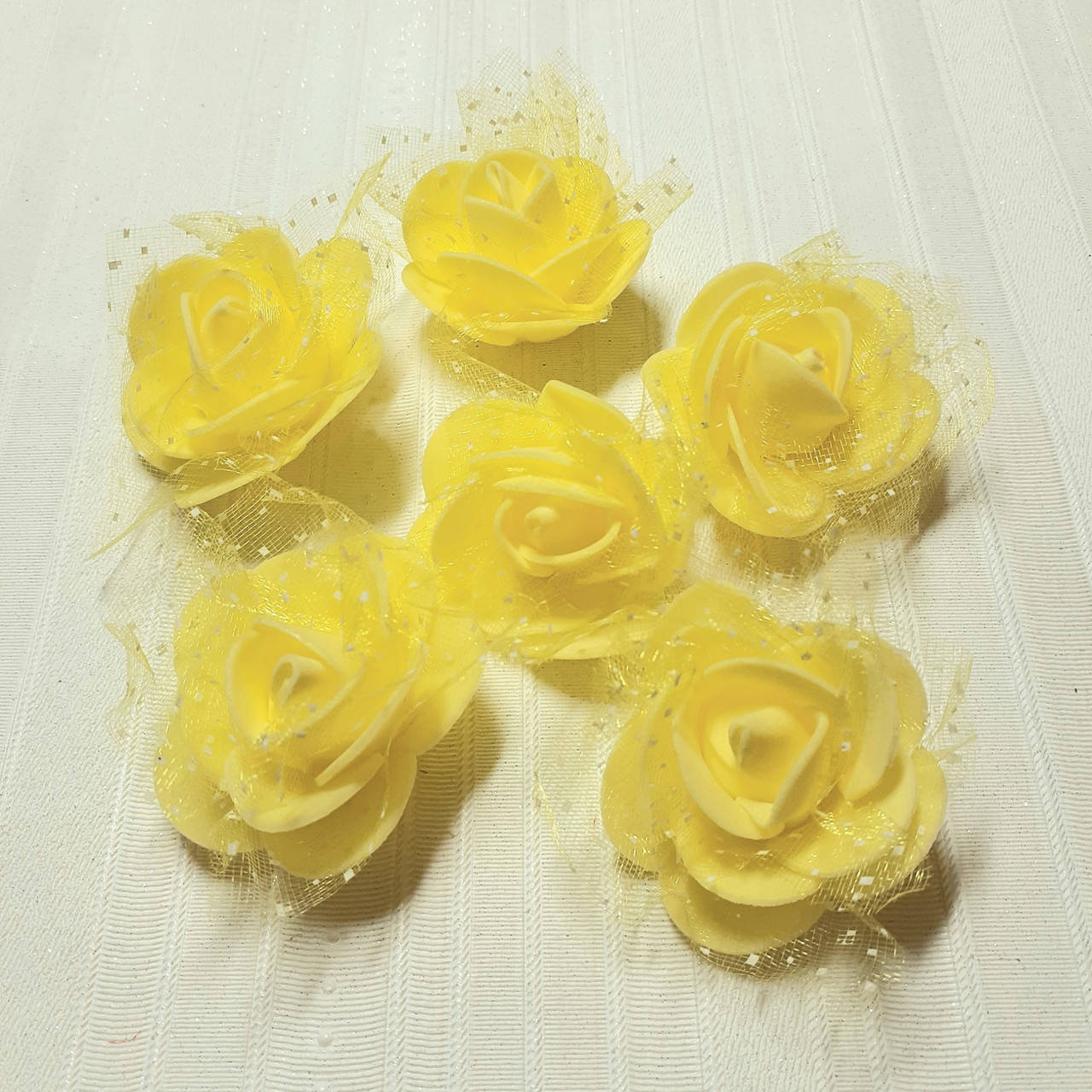 Розочки из фоамирана с фатином, цвет - желтый, диаметр цветка - 3,5 см, 6 шт
