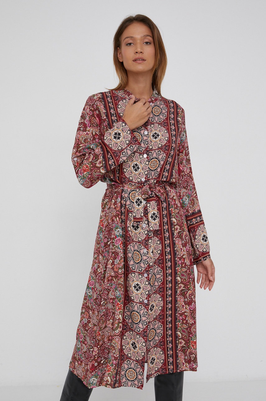 Рокля от колекция Answear Lab. Разкроен модел, направен от материя с шарки.- Разкроен модел.- Дълъг ръкав.- Овално деколте.- Закопчаване с копчета.- С колан при талията.- Тънка нееластична материя.- Дължина на ръкава: 64 cm.- Дължина: 124 cm.- Ширина под мишниците: 52 cm.- Мерките се отнасят за размер: S/M.