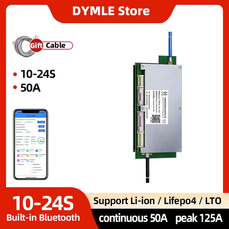 Smart ANT BMS 10-24S 36V 48V 60V 72V 11S 13S 15S 17S 19S Continuous 50A peak 125A Bluetooth Built-in Li-ion Lifepo4 Lto Battery