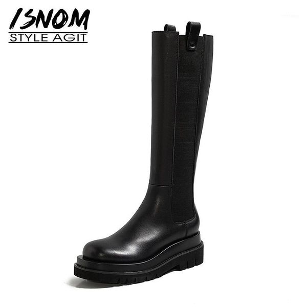 boots isnom 2021 arrival knee high boot genuine leather round toe slip on autumn winter wedges shoes woman platform1, Black