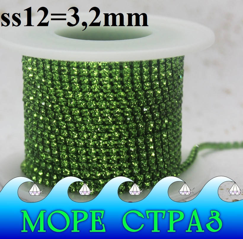 Густая цепочка из стразов Grass Green ss12=3,2мм оправа зеленая трава перидот яблоко 10см Peridot