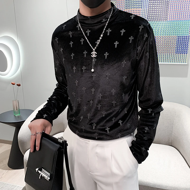 Роскошная Стразы Мужская футболка с высоким воротником, облегающая Повседневная футболка в деловом стиле с длинным рукавом, Мужская Уличная рубашка