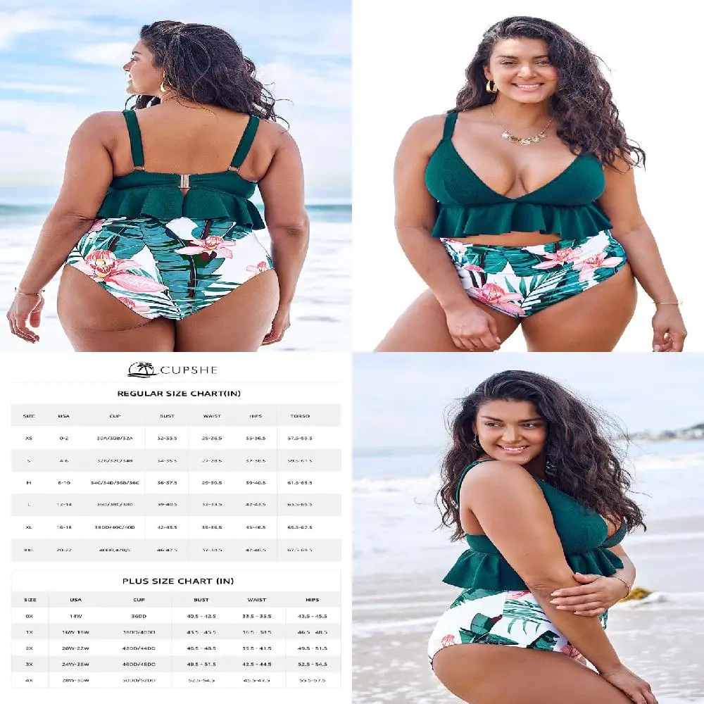 Роскошное зеленое бикини XL с оборками и высокой талией с цветочным принтом