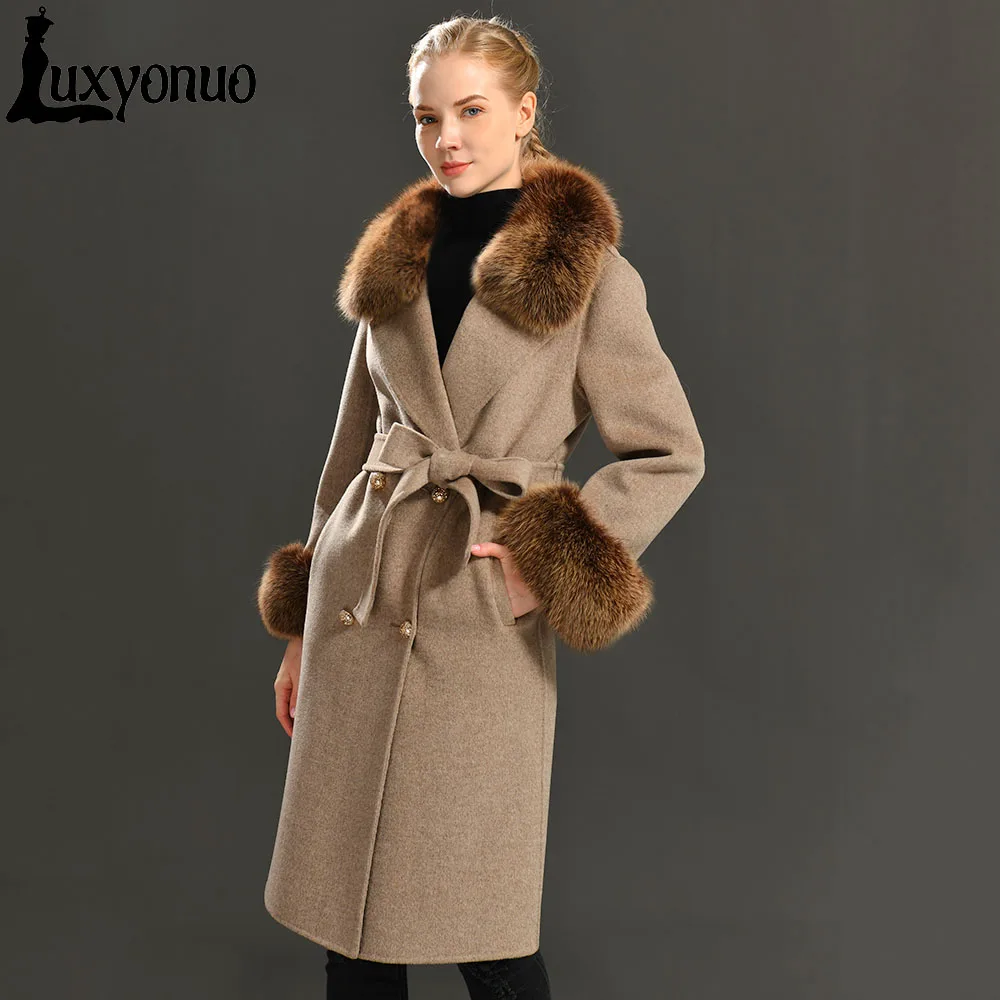 Роскошное кашемировое шерстяное пальто Luxyonuo, женское длинное пальто с воротником из натурального Лисьего меха на весну и зиму, облегающее Женское пальто с регулируемым поясом