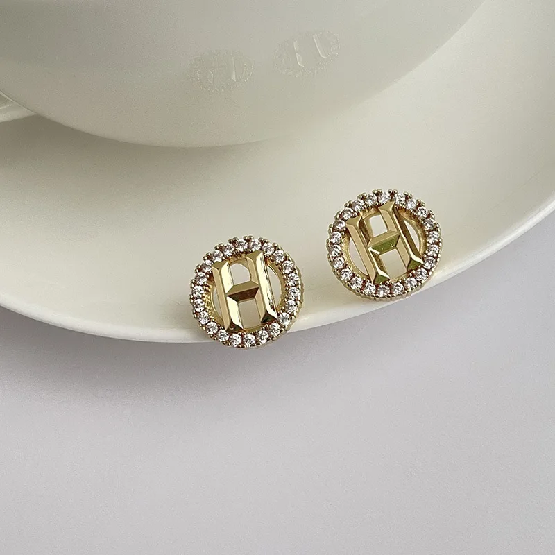 Роскошные модные брендовые дизайнерские круглые Кристальные бусины, инкрустированные проколотыми золотыми серьги-гвоздики с буквой H для ...