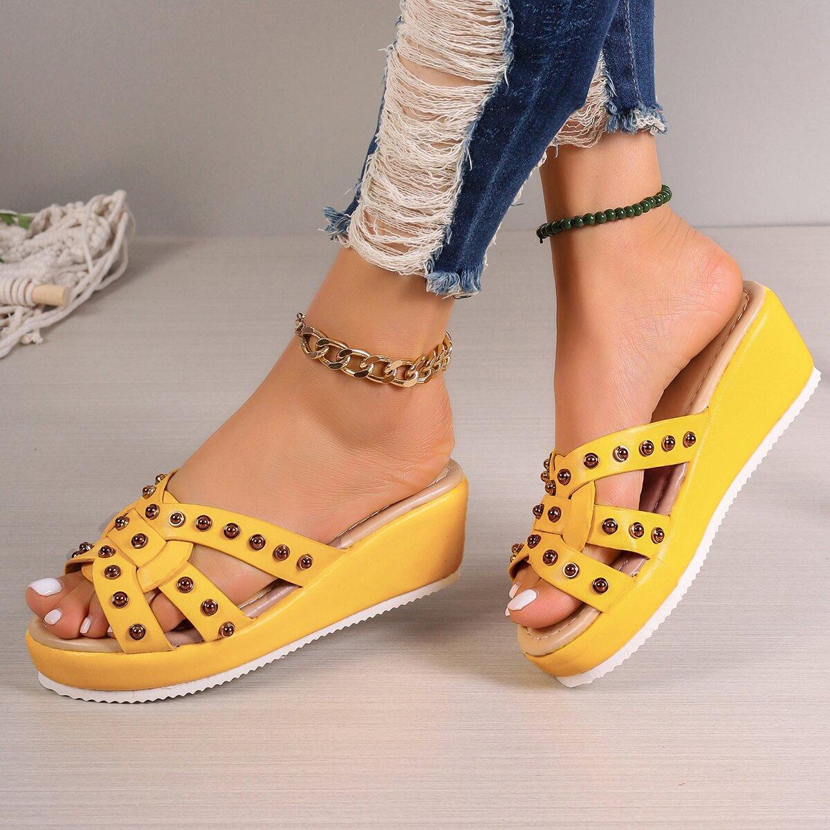 Роскошные повседневные тапочки на покатом каблуке для женщин, лето 2024 г., новые тапочки с выемкой в виде рыбьего рта и сосновой подошвой для верхней одежды 43 жёлтый