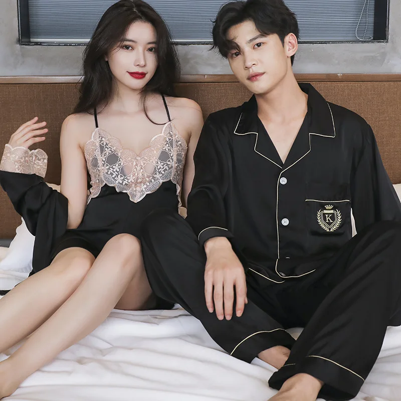 Роскошный женский Шелковый пижамный комплект для влюбленных, однотонный сексуальный женский халат, кружевная ночная рубашка с аппликацией, мужская рубашка, штаны, одежда для сна