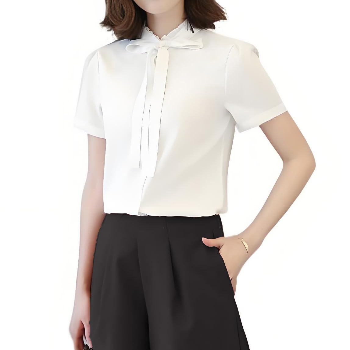 Рубашка блузка с оборками на шее и короткими рукавами, рубашка для платья, приталенная, летняя, весенняя, осенняя, с застежкой спереди, аккуратная, однотонная, белая, для работы, офиса, бизнеса