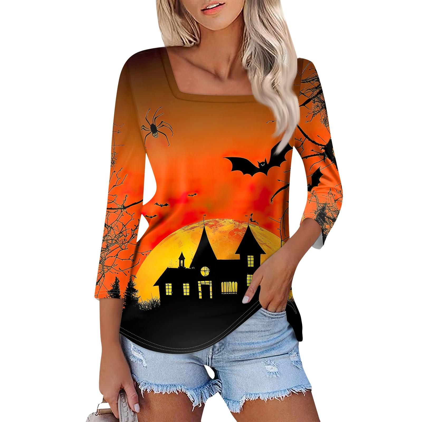 Рубашка для женщин, модная, повседневная, с квадратным вырезом, рукавом 3/4, свободная, с принтом на Хэллоуин, женская футболка, топ XXL