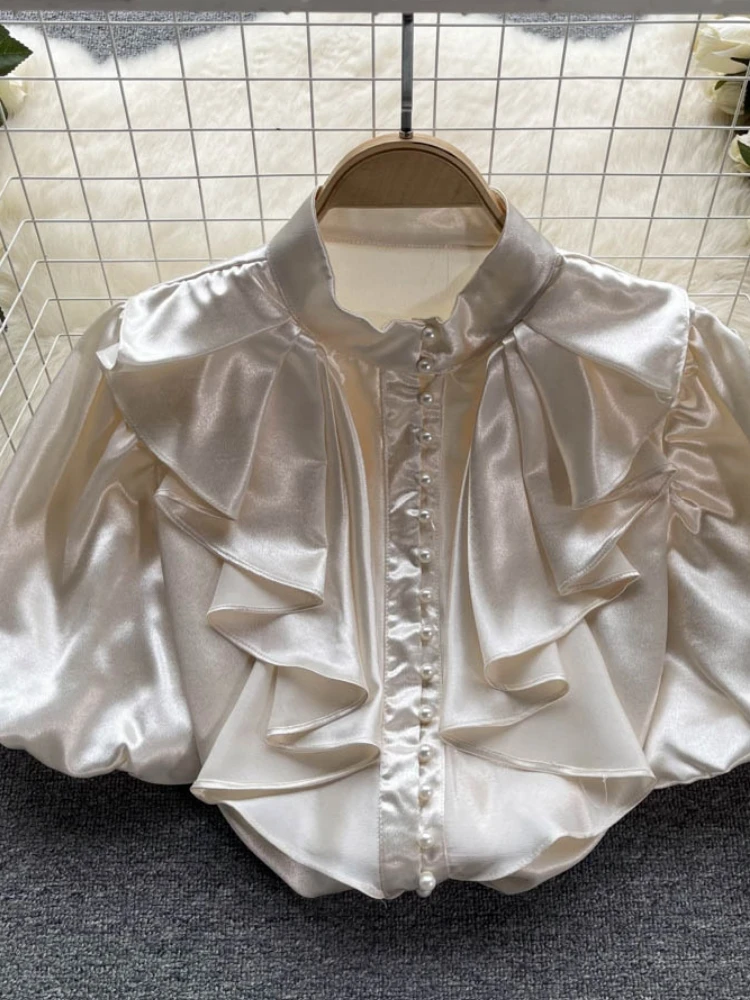 Рубашка женская с коротким рукавом-пузырьком и воротником-стойкой