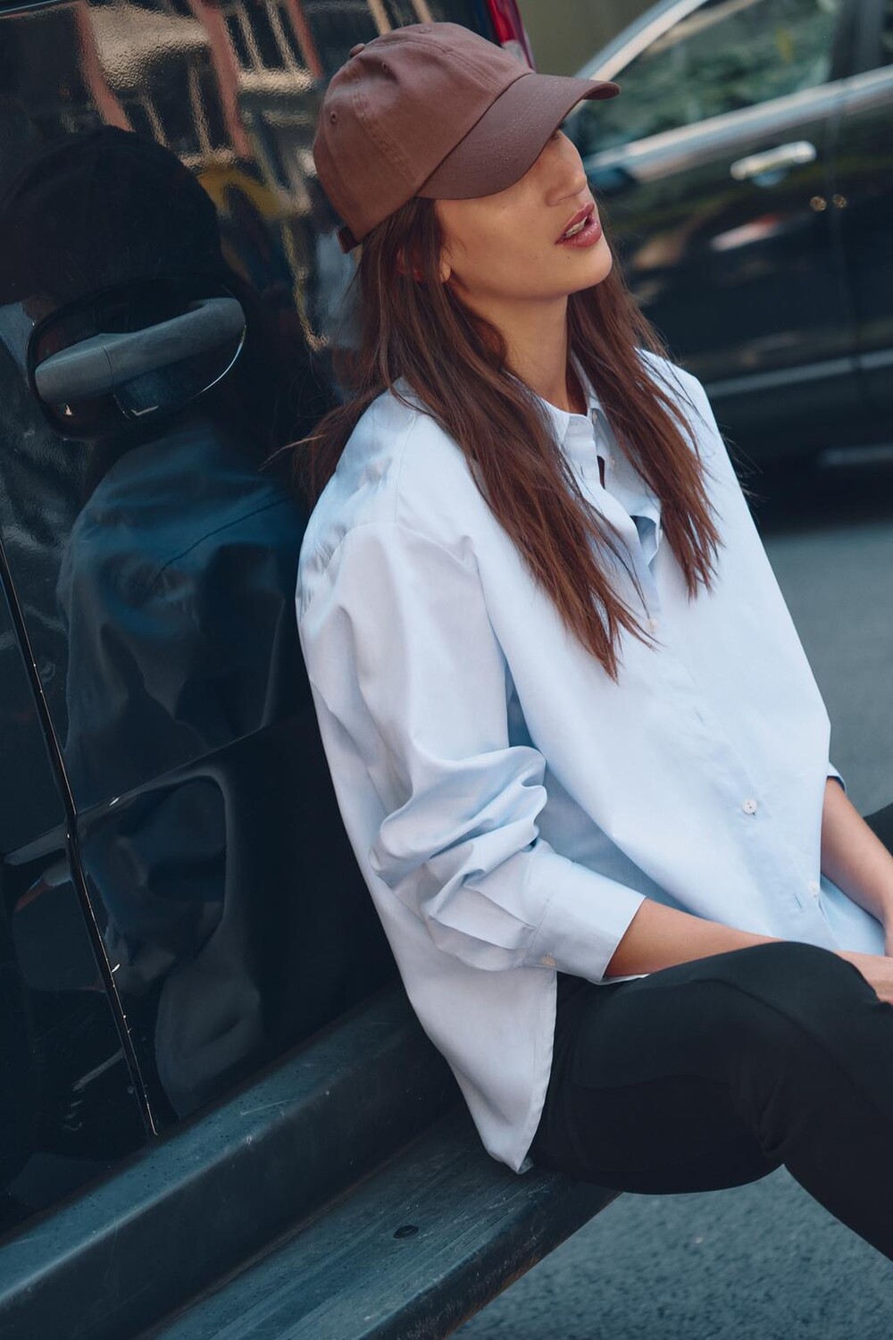 Рубашка oversize из 100% хлопка. Воротник, длинные рукава с приспущенным плечом, плиссированные манжеты и застежка на пуговицы спереди.