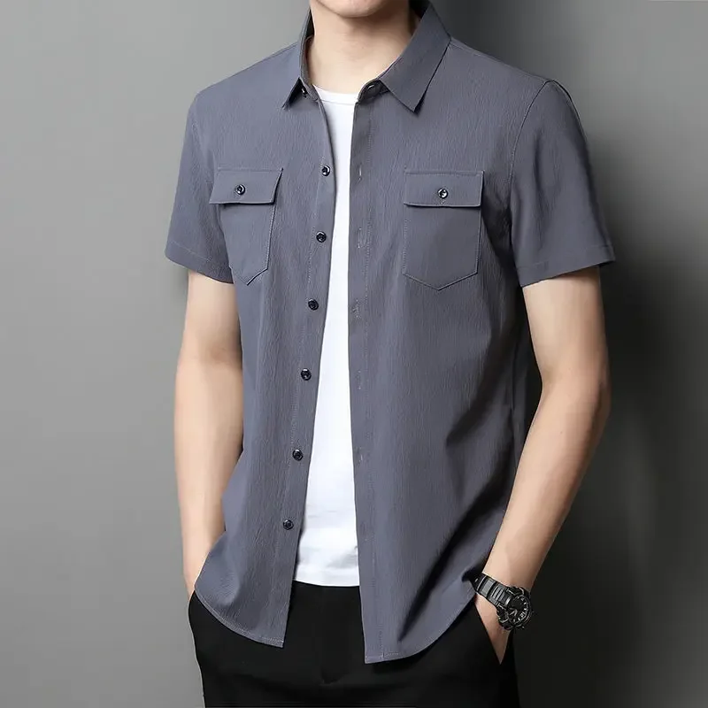 Рубашка-карго мужская с карманами, однотонная блузка с коротким рукавом, элегантный воротник, приталенный силуэт, винтажный Топ, размеры Xxl
