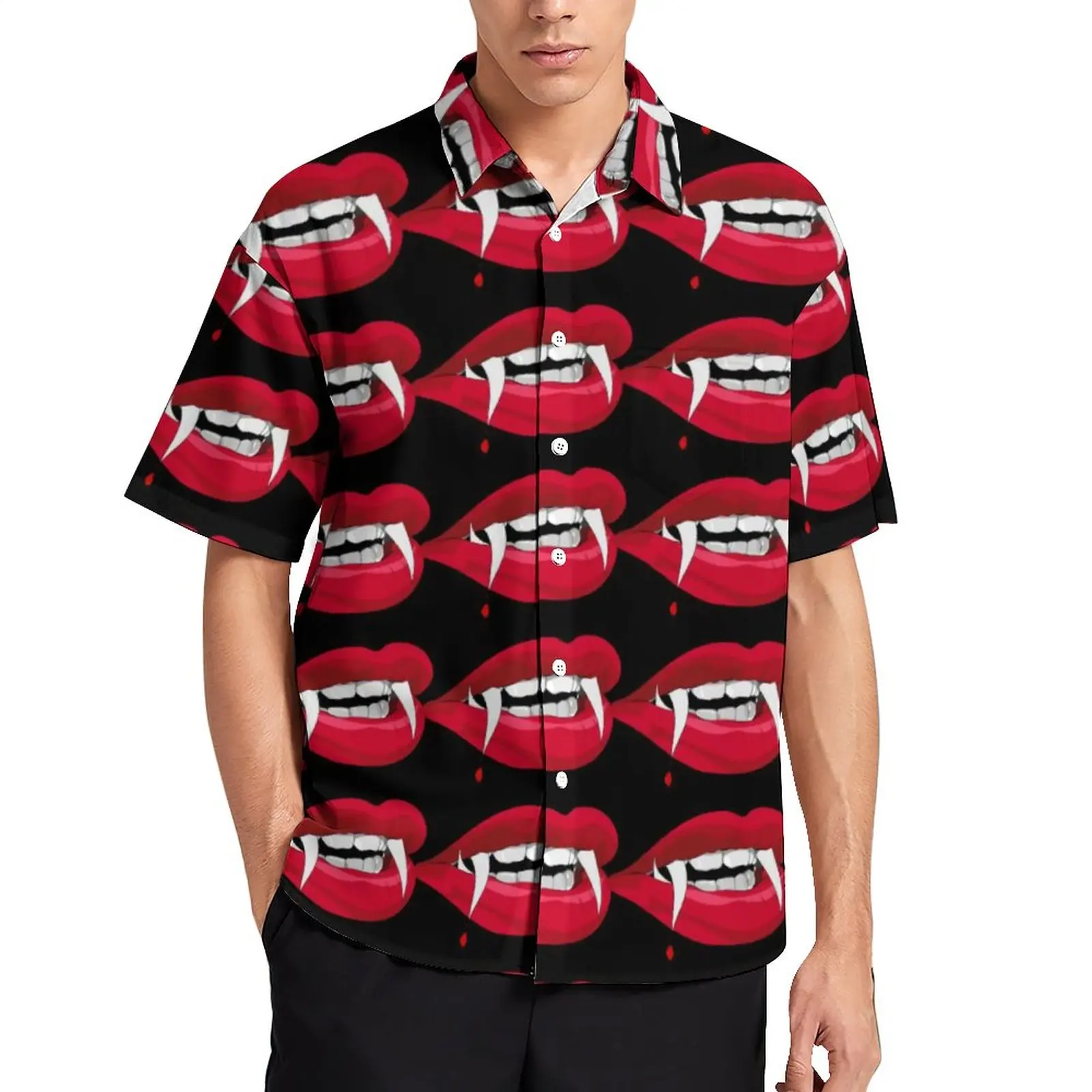 Рубашка мужская Свободная с принтом клыков и губ, Пляжная повседневная с коротким рукавом, в гавайском стиле, в стиле кэжуал, для Хэллоуина, ...