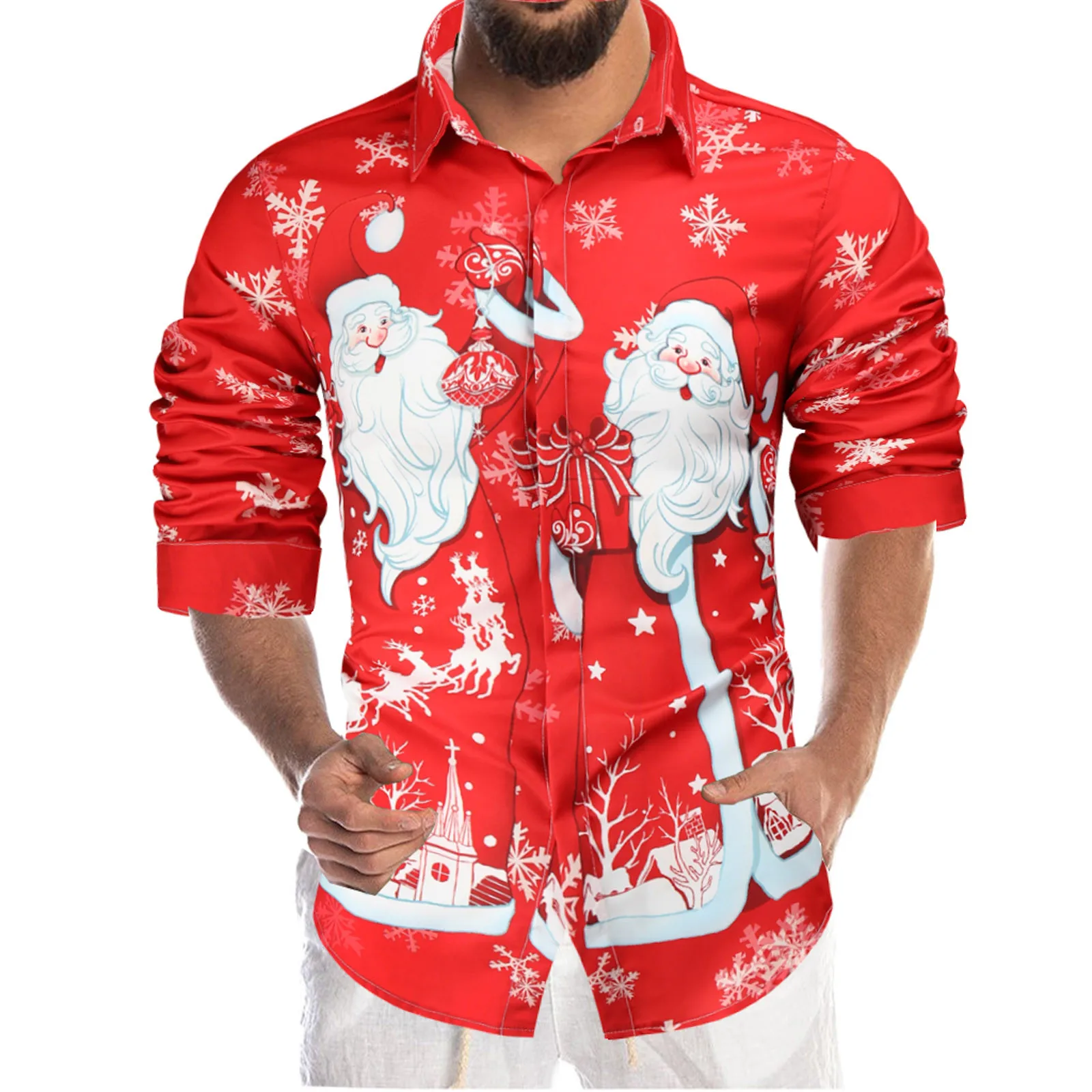 Рубашка мужская повседневная с отложным воротником, модная блузка с 3D принтом, сорочка легкая с цифровым принтом, рождественский стиль