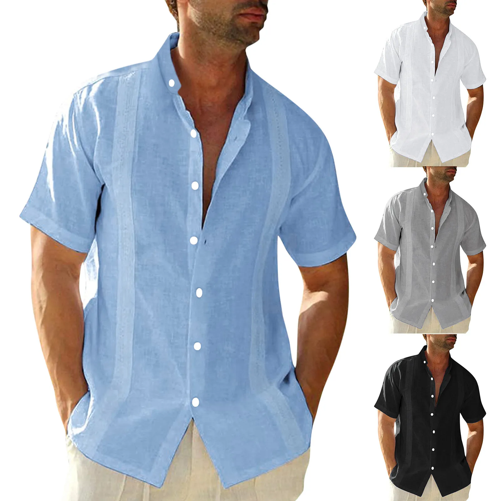 Рубашка мужская с вышивкой по краям, однотонная блузка на пуговицах, с коротким рукавом, воротник-стойка, топ, Мужская одежда, лето