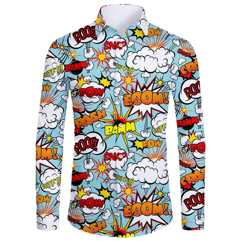 Рубашка мужская с забавным 3D принтом, повседневная с абстрактным изображением бум и граффити, крутая с длинными рукавами в стиле Харадзюку, уличная одежда в гавайском стиле