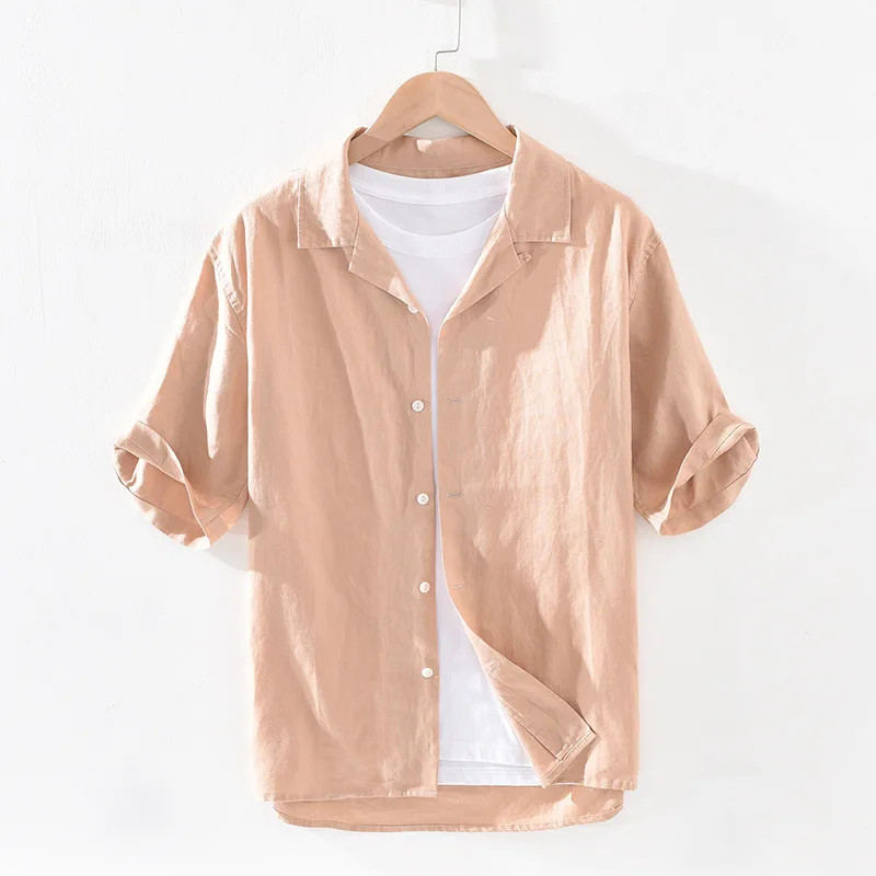 Рубашка мужская с коротким рукавом, тонкая блуза из чистого льна в японском стиле, тонкая приталенная, с отложным воротником, одежда в стиле ...