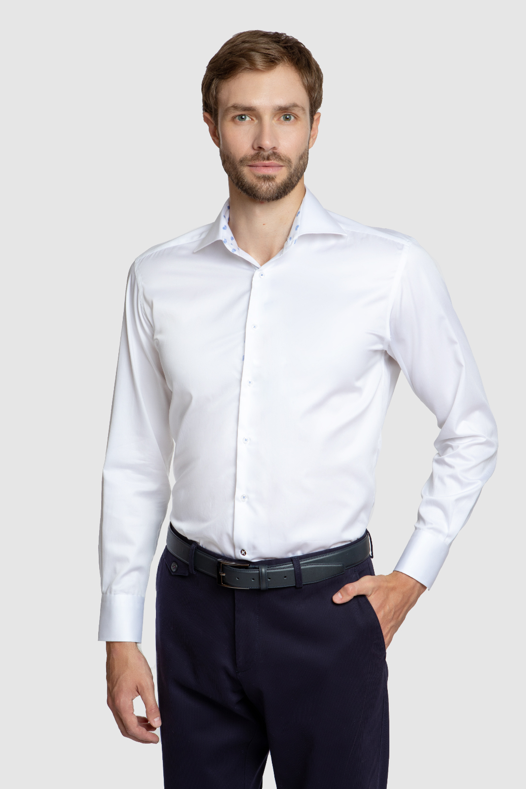 Казалось бы простая и лаконичная белая сорочка. Но нет, не простая! А с изюминкой! Которая становится заметной, если слегка расстегнуть воротничок сорочки. И вот она - стильная отделка воротника и передней полочки модным принтом пейсли. Это тот самый случай, когда нужна классическая белая сорочка, но при при первой возможности хочется показать насколько она оригинальна. Эта модель сорочки выполнена из безупречной 100% хлопковой ткани в полуприталенном силуэте, а значит хорошо сядет на стройных мужчин и будет радовать приятными ощущениями. Материал: