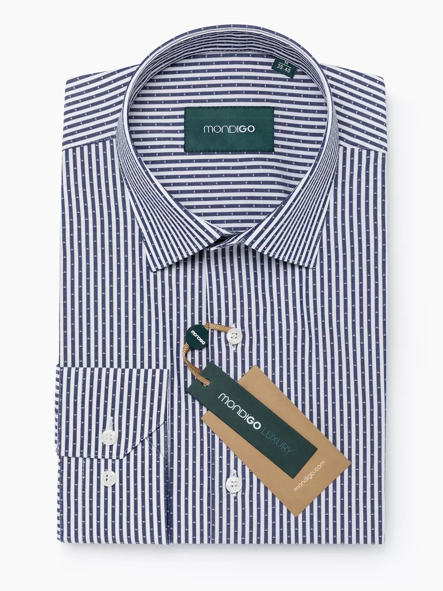 Мужская рубашка на пуговицах фирмы MONDIGO - это превосходный выбор для мужчин, которые ценят классический и деловой стиль. Плотная праздничная сорочка имеет длинные рукава, что делает ее отличным вариантом в демисезон. Изделие можно носить в нежаркий летний или весенний периоды. Оптимально также на осенний или зимний сезон. Изготовлено из высококачественного хб материала, что обеспечивает комфорт и приятное ощущение на теле в течение всего дня. Хлопковая ткань сохраняет мягкость, цвет после стирки, дышащие свойства натурального материала, при этом легче гладится, лучше держит форму, меньше подвержена деформации. Приталенный крой, подчеркивает достоинства подтянутого телосложения. Идеально на рост 170-180 см. Английский воротник дополняет общий стиль и позволяет Вам носить ее в разных ситуациях - как в повседневной жизни, так и на официальных и вечерних мероприятиях, будь то свадебное торжество или выпускной в школе. Эта стильная нарядная рубаха поможет собрать как крутой образ на офисные встречи, так и будничный лук для любителей кэжуал стиля. Фасон одежды дает возможность надевать ее и на выпуск, создавая аккуратный и красивый силуэт. Модная молодежная модель будет идеальным выбором как для взрослых парней, так для подростков школьников в качестве элемента школьной формы. Полосатая рубашка фирмы MONDIGO - это отличный подарок Вашему защитнику на 23 февраля!