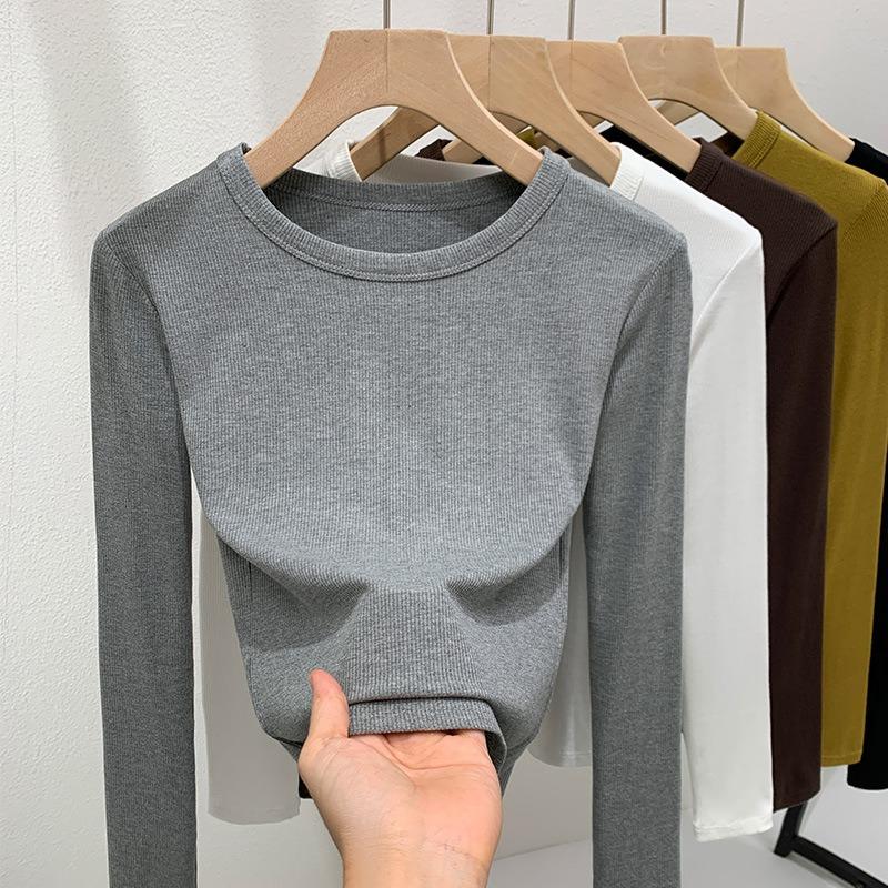 Рубашка с резьбой по низу женская новая женская одежда переднее плечо круглый вырез длинный рукав тонкая рубашка осень и зима внутренняя талия топ XL светло-серый