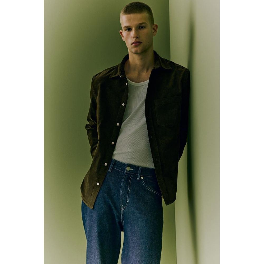 Рубашка HM Regular Fit Corduroy, темно-зеленая, цвета хаки M
