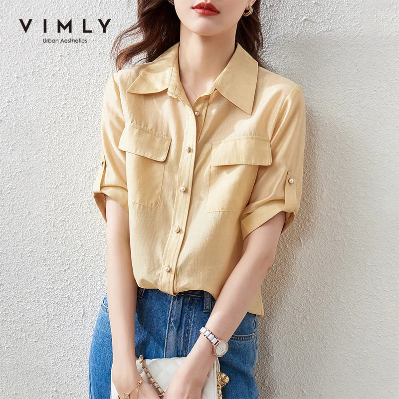 Рубашка VIMLY Женская на пуговицах, модная повседневная однотонная блузка с коротким рукавом, Свободный Топ, F7027, на лето