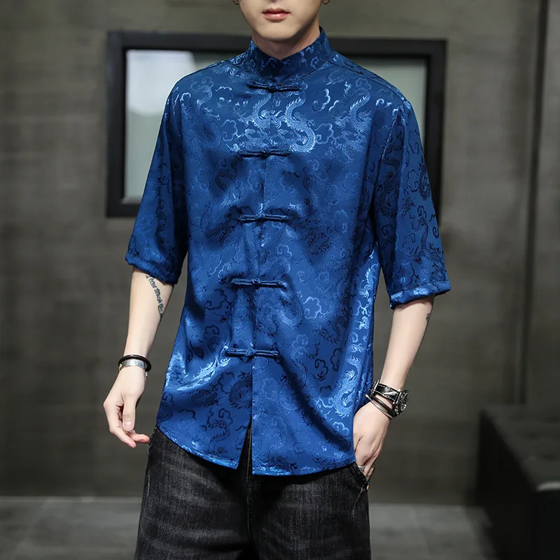 Рубашка Yourqipao мужская с коротким рукавом, жаккардовая блуза с китайским традиционным драконом кунг-фу, Элегантная сорочка джентльмена