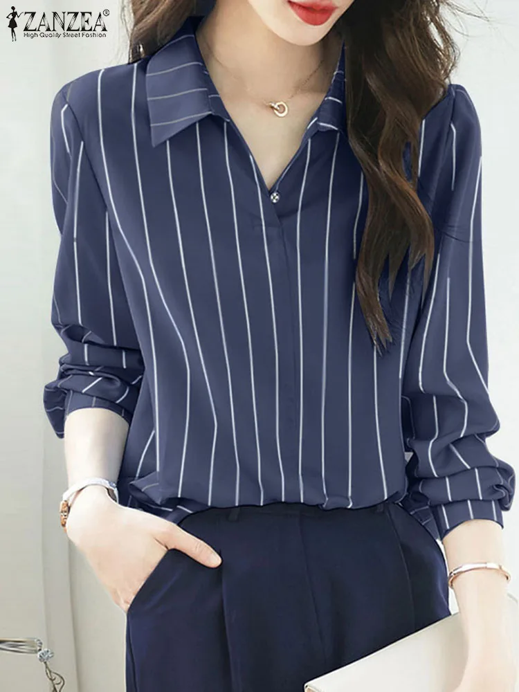 Рубашка ZANZEA женская с принтом в полоску, модная блузка с длинным рукавом и воротником с лацканами, Повседневная Уличная одежда, офисный топ на весну