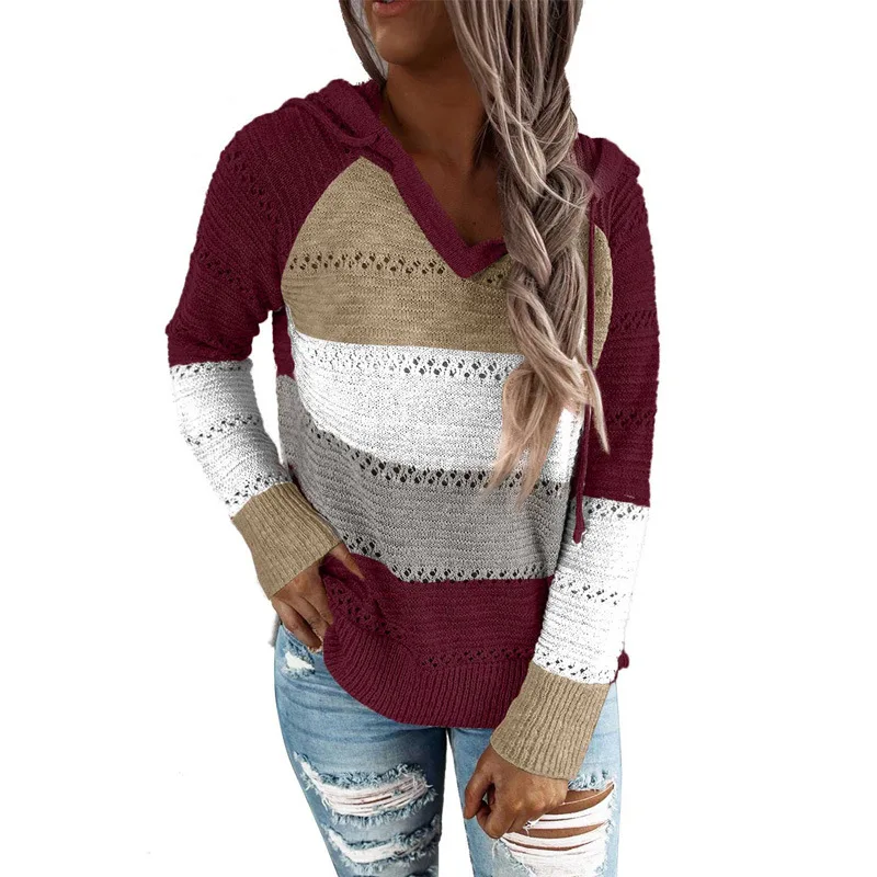 New loose hollow hedging stitching striped pullover women long sleeve hoodies wool knitted sweater