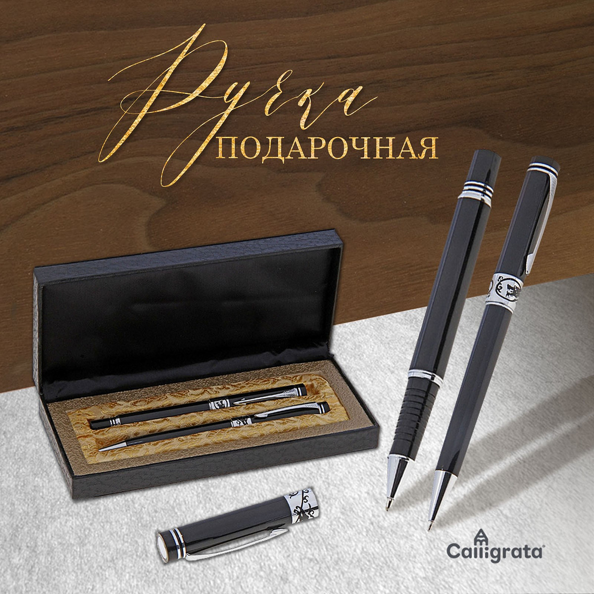 Ручки подарочные, 2 шт.: капиллярная, шариковая поворотная, в кожзам футляре, vip, черные, Черный