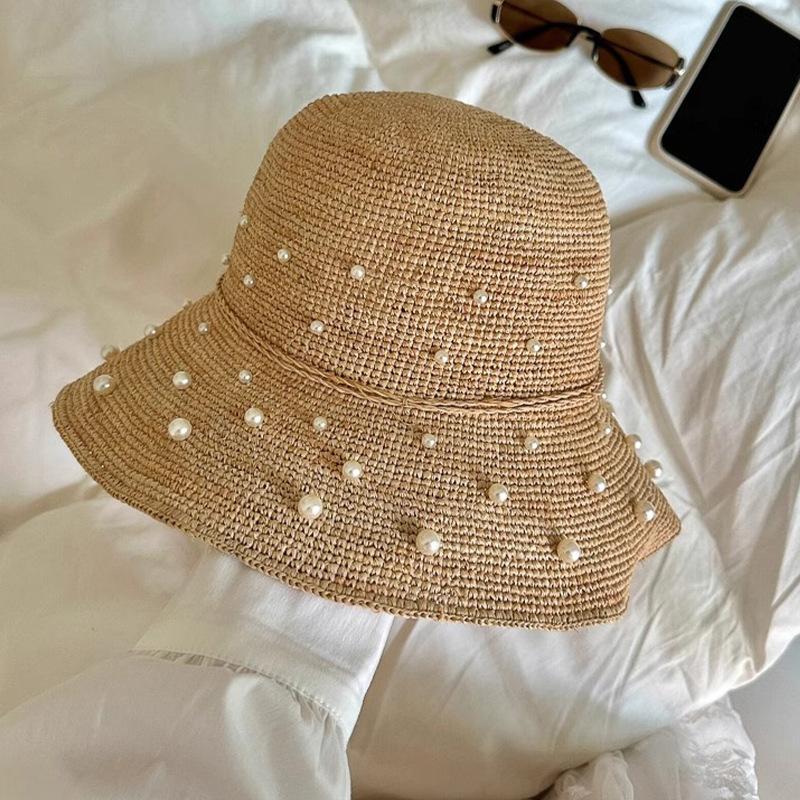 Ручная работа Жемчужный бант Панама Женская Летняя Корейская версия Широкие поля Пляжная Солнцезащитная шляпа Защита от УФ-лучей