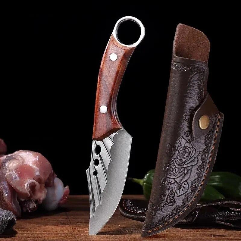 Ручная ручка из нержавеющей стали, нож с кольцом для мяса, портативный острый нож для резки барбекю, нож для обвалки, нож для еды баранины и свинины 1pcs with cover