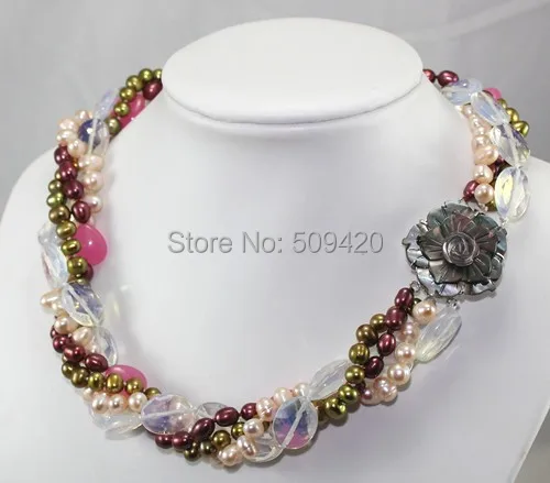 Free Shipping >>>4Strands Multicolor Akoya Cultured Pearl&Moonstone Necklace Shell Flower