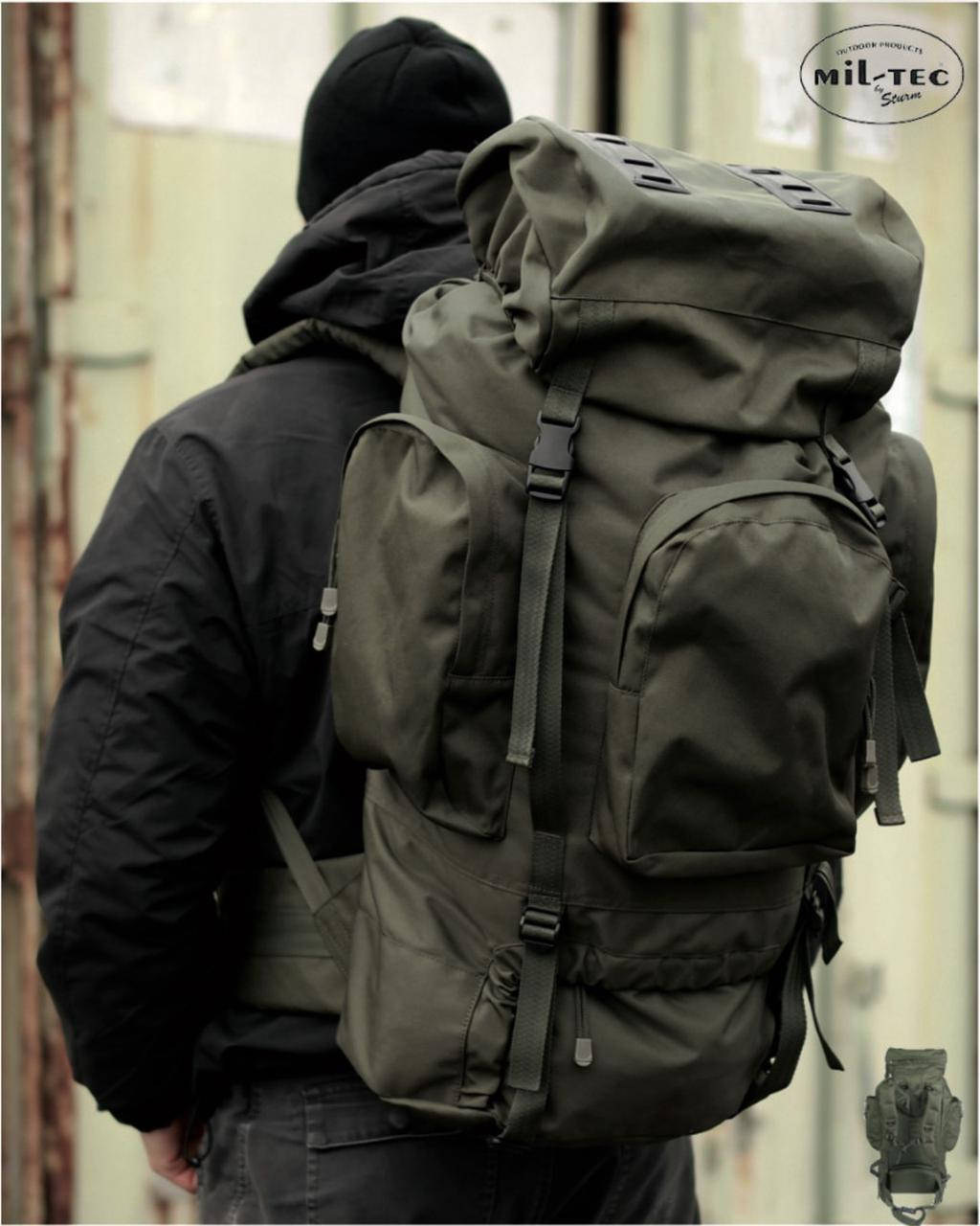 Плечові рамки регулюються по росту і об'ємом. Класичний, похідний рюкзак на 85 літрів від німецької компанії Mil-Tec. Матеріал виготовлення - поліестер з полівінілхлоридним (водовідштовхувальним) покриттям.