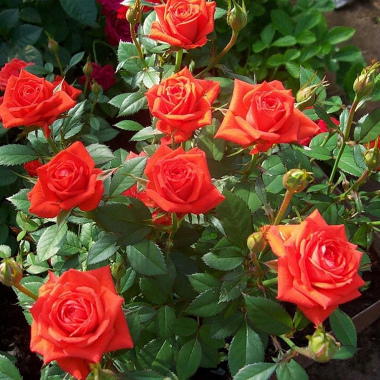 Роза почвопокровная Миниатюра Ориндж Побеги ветвистые, с мелкими зелёными листочками. Куст до 60 см высотой. Цветение непрерывное в течение всего сезона.