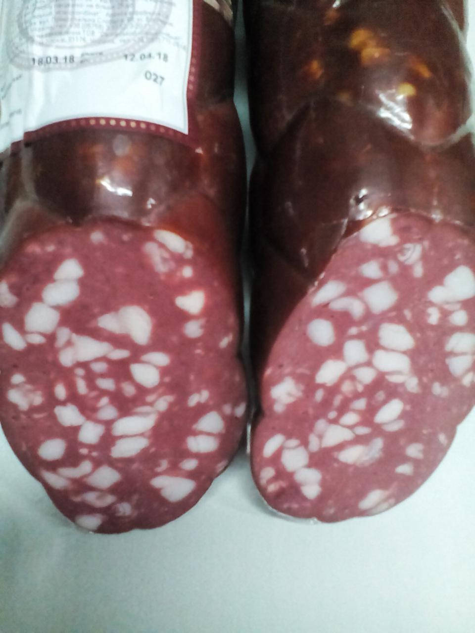 Склад:яловичина, м"ясо птиці, сало, сіль, суміш спецій, нітрит натрію. Вага виробу 0,9-1 кг
