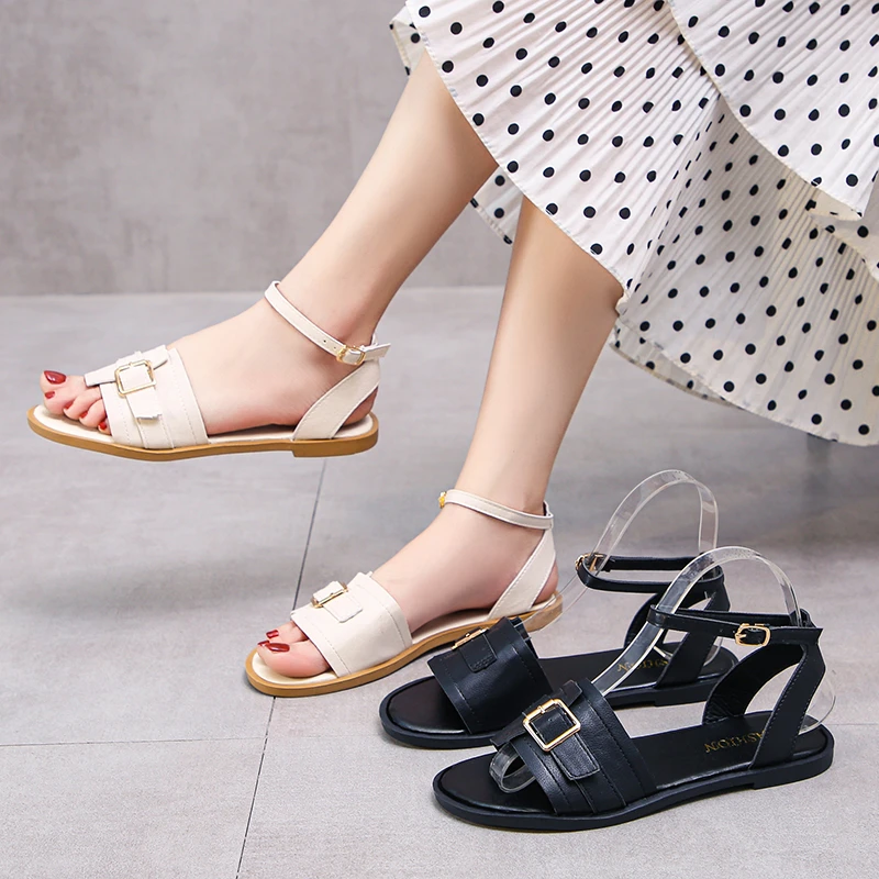 Сандалии женские на плоской подошве, пляжные босоножки с пряжкой, повседневные туфли с круглым носком, лето, 2021