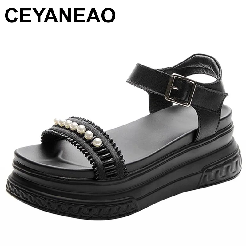 Сандалии женские на танкетке 7 см, натуральная кожа, дышащие, с жемчужинами, пряжка, летняя обувь на массивной подошве