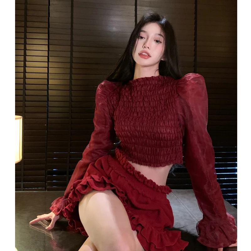 Autumn And Winter French Retro Temperament Design Sense Bubble Long Sleeve T-Shirt Top Ruffle Pumpkin Shorts Red Two-Piece Set