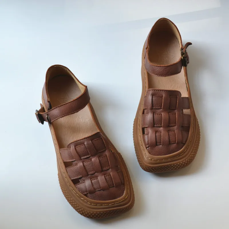 Сандалии женские ручной работы, Натуральная Воловья кожа, плоская подошва, дышащая ретро Обувь для пожилых