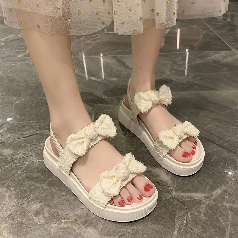 Сандалии женские с бантом, мягкие босоножки на платформе, открытый носок, Мягкие Шлепанцы, белый цвет, лето