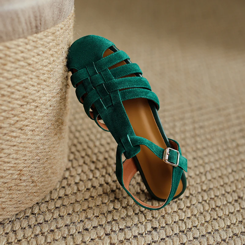 Сандалии женские с закрытым носком, натуральная замша, плоская подошва, ремешок с пряжкой, римские стиль, гладиаторы, летняя обувь