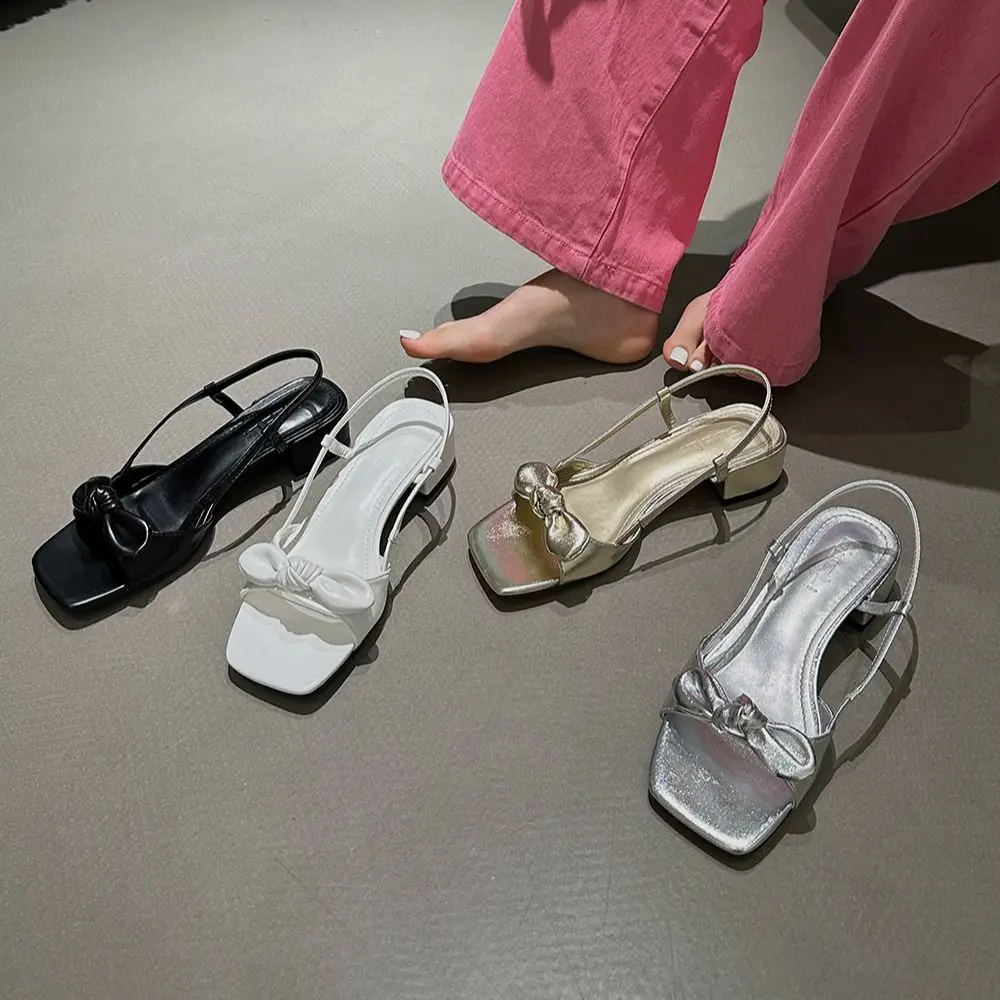 Сандалии женские с открытым носком, босоножки без задника, бантом, ремешком сзади, низкий каблук, сланцы, черные, белые, золотые, серебристые, летняя обувь