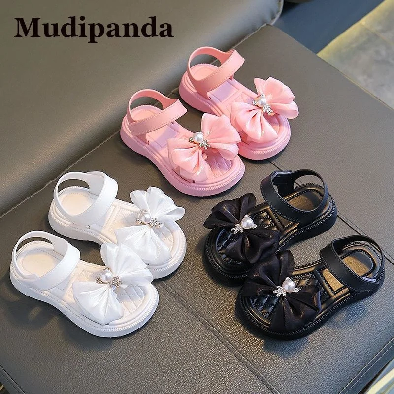 Сандалии с розовым бантом для девочек, белые сандалии с открытым носком и бантом для детей и девочек, лето 2023