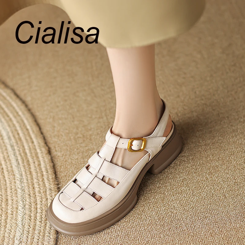Сандалии Cialisa женские из натуральной кожи, босоножки в римском стиле на платформе, повседневная обувь ручной работы с ремешком и пряжкой, толстый каблук средней высоты 5 см, коричневые, на лето